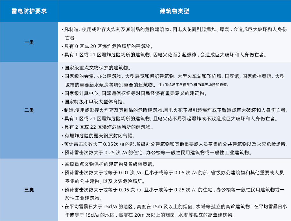 雷电防护等级与建筑物类型的对应关系